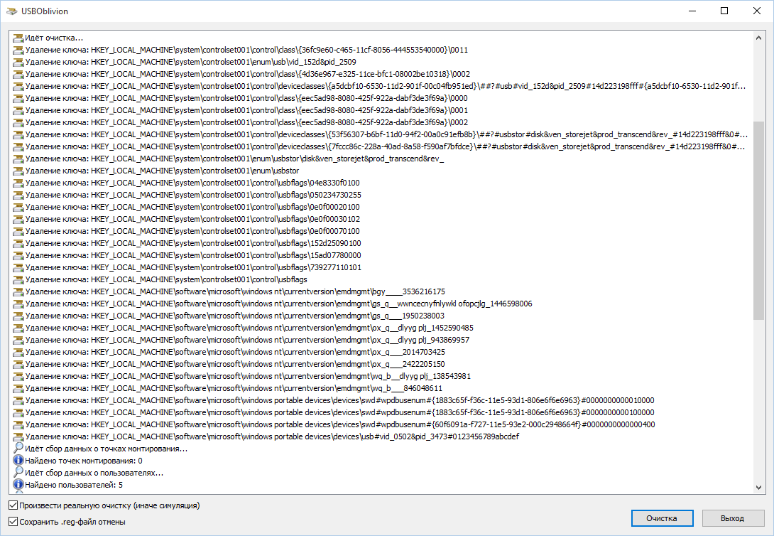 Программа не только чистит реестр, но и выводит подробный лог своих действий (см. ниже). Когда она завершит работу, не останется никаких упоминаний о подключении накопителей к компьютеру.