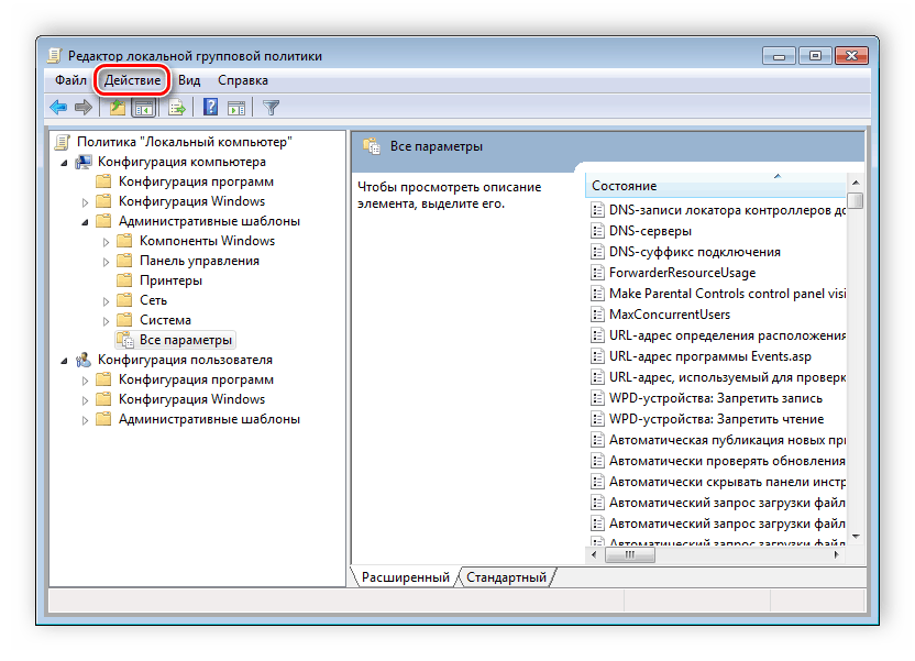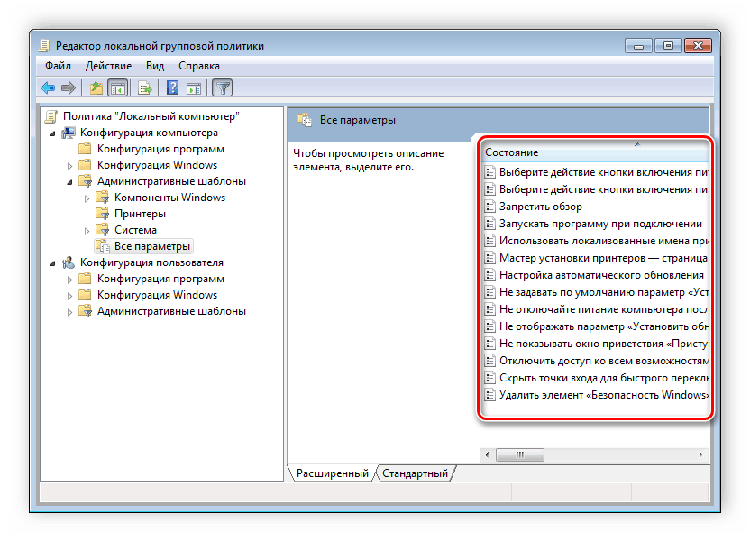 пункт в правой части редактора «Все параметры», что приведет к открытию всех политик