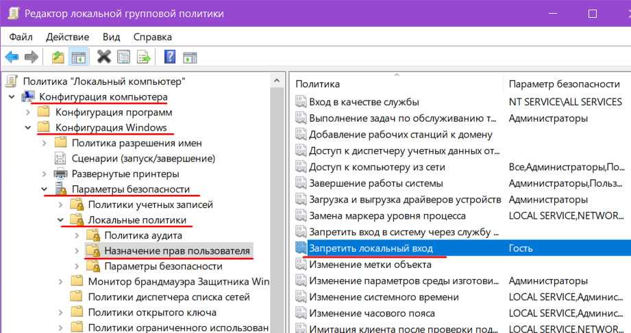 Раскрываем путь, указанный на скриншоте. Открываем параметр, запрещающий локальный вход.