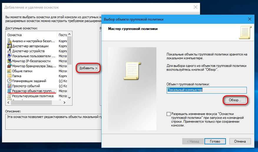 Кликаем «Редактор объектов групповой политики». Нажимаем «Добавить», затем — «Обзор».