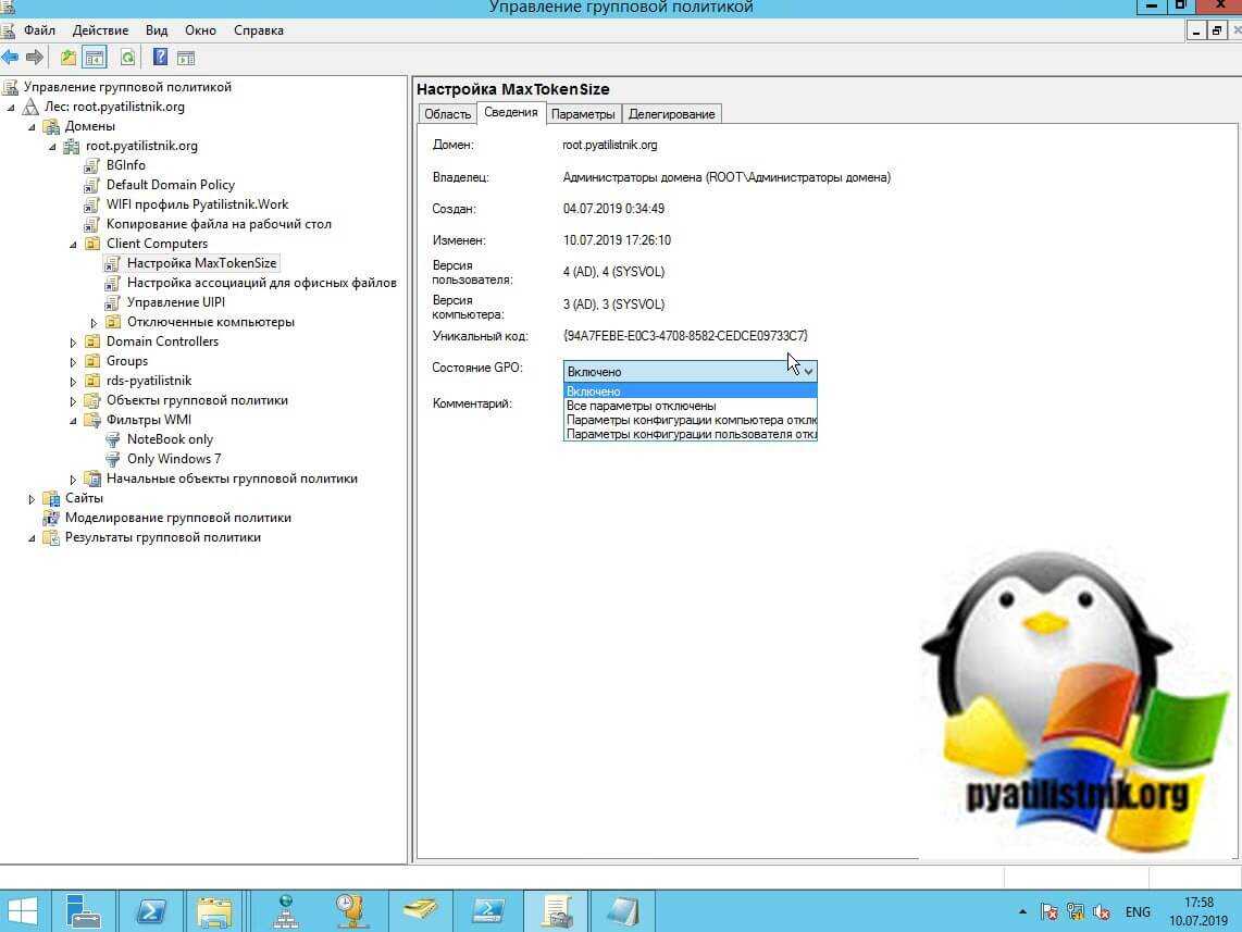 Еще на вкладке «Сведения» есть такая настройка, как состояние GPO. Она необходима для ускорения обработки политики, путем отключения лишних веток. Например у вас политика исключительно на пользователя и вам смысла нет, чтобы компьютер при загрузке пытался прочитать настройки для компьютера, тратя на это время. В таких случаях отключают данный функционал. Тут есть варианты: