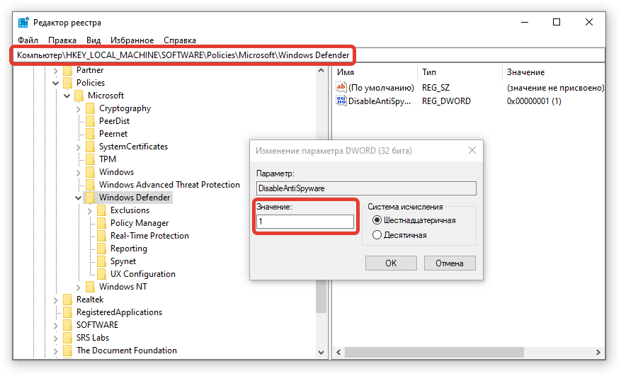 Когда служба защиты Windows отключится, можно будет установить обновления без риска появления ошибки. Для включения стандартного антивируса нужно в свойствах нового параметра вписать значение 0.