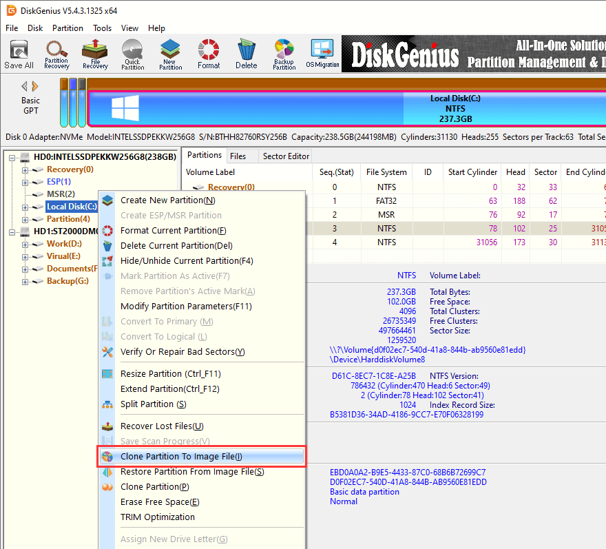 1. Select the Windows system partition (C: partition in common), then right-click it and select «Clone Partition To Image File», as follows: