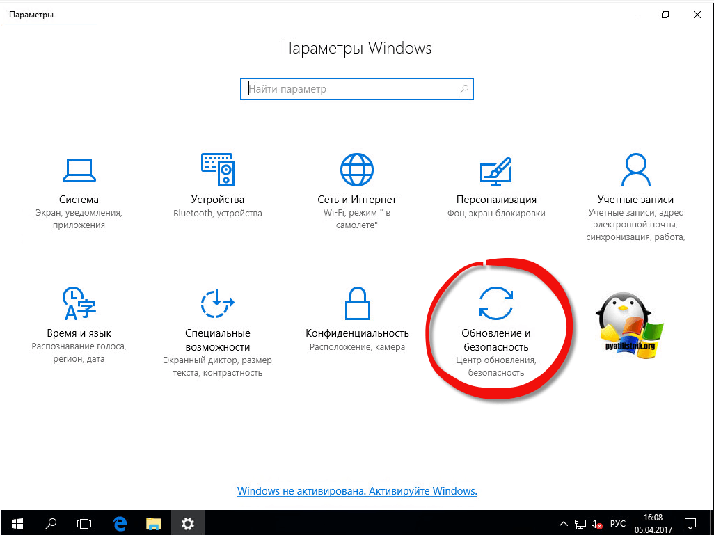 Или можно нажать быстрое сочетание клавиш Windows 10 Win+I и у вас откроется окно «Параметры Windows». Переходим в нем в обновление и безопасность.