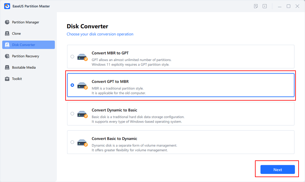 Step 2. Select «Convert GPT to MBR» and click «Next» to continue.