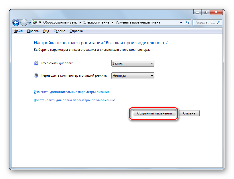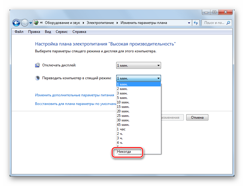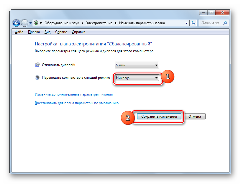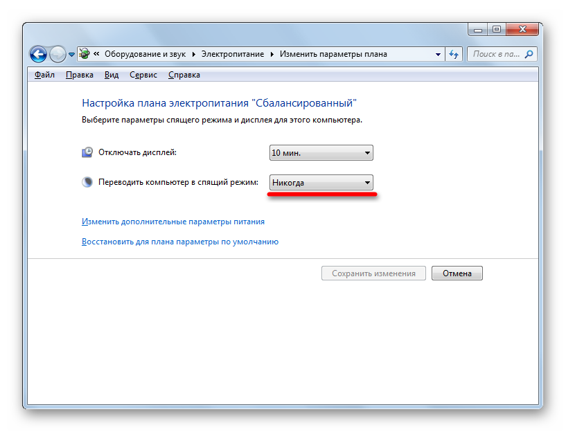 Открывается уже знакомое нам по предыдущему способу окно параметров плана энергопитания. В поле «Переводить компьютер в спящий режим» остановите выбор на пункте «Никогда» и жмите «Сохранить изменения».
