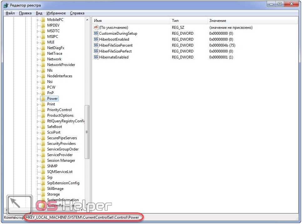 Если нужно удалить файл hiberfil.sys, а не просто деактивировать гибернацию ради освобождения пары ГБ пространства, изменяем этот ключ, иначе идём дальше.