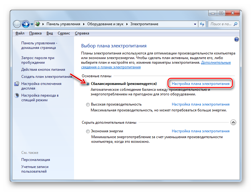 4. В поле включенного плана электропитания (по умолчанию установлен «Сбалансированный») кликните «Настройка… ».