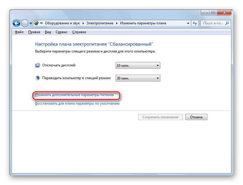 - После того, как было совершено перемещение в окно настройки задействованного плана энергопитания, любым из тех двух вариантов, которые были описаны в предыдущих способах, жмите «Изменить дополнительные параметры питания».