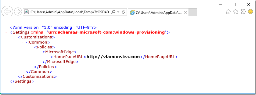 Anyway, the packages that you create, ends with the PPKG extension, but they are really just WIM files, meaning you can mount them using ImageX/DISM/7-Zip and even do changes on the fly to them (even though that never was the intention, and is not supported either ). Here is the content in a provision package that sets the Microsoft Edge home page.