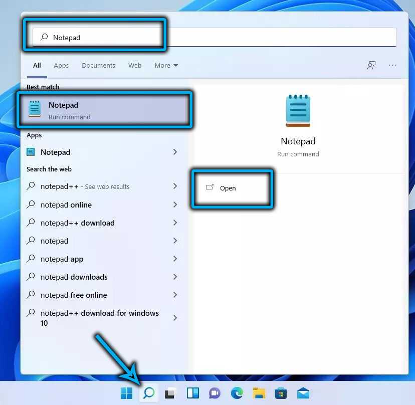 - Откройте меню «Пуск» и запустите приложение «Блокнот».