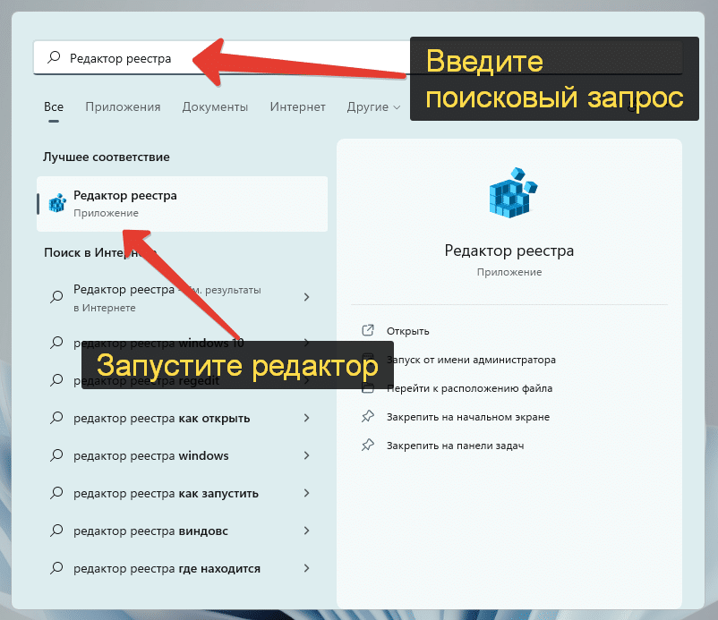 Запустить Редактор реестра можно из меню «Пуск», воспользовавшись функцией поиска.