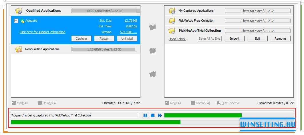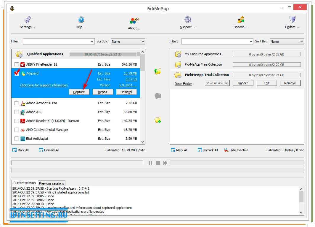 Выберите в левой панели программы, которые хотите перенести с одного компьютера на другой, в нашем примере это программа Adguard, и затем кликните по кнопке “Capture”, как показано на рисунке ниже.