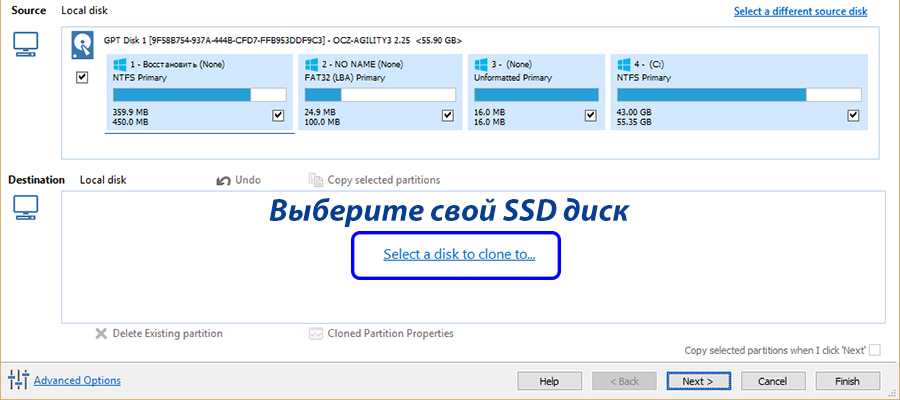 - Внизу окна нажмите Select Disk to Clone и укажите ваш SSD диск