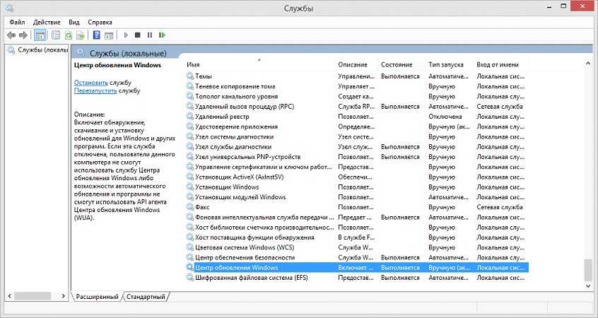 После этого всплывёт ещё одно окно. В нём будут находиться все службы, запущенные на данном компьютере. Для того, чтобы избавиться от зависания компьютера с надписью «Подготовка к настройке Windows», следует найти «Центр обновления Windows». Как правило, находится эта служба чуть ли не в самом низу, если отсортировать по имени.