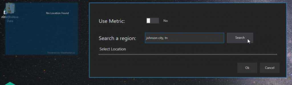 Прежде чем это заработает, вам нужно выбрать значок шестеренки и установить настройку местоположения, где вы хотите видеть погоду.