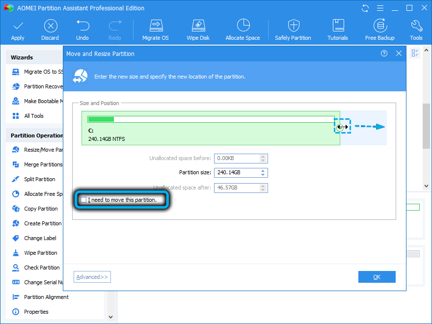 В левом меню («Операции над разделом») выбираем пункт «Изменение раздела». Откроется новое окно, в котором ставим галочку напротив строки «I need to move this partition» («Мне нужно переместить этот раздел») и перетаскиваем ползунок право до упора. При этом параметр «Unallocated space before» («Незанятое место перед») должен обнулиться.