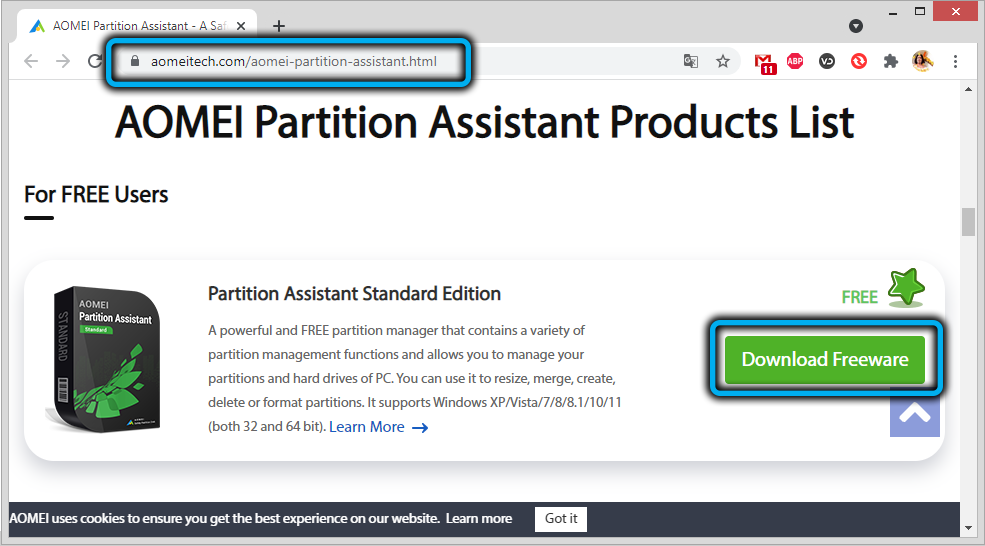 Скачиваем утилиту AOMEI Partition Assistant с официального сайта, запускаем. В главном окне выбираем диск, к которому нужно присоединить освободившееся место.