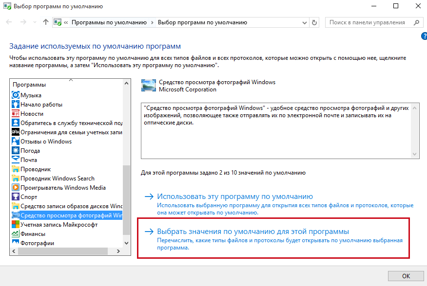 В левой колонке открывшегося окошка выберите приложение «Средство просмотра фотографий Windows», нажмите «Выбрать значения по умолчанию для этой программы»…