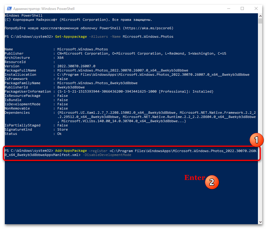 Выполните команду , прописав ее и нажав на клавишу «Enter». Обратите внимание на строку «PackageFullName». Ее значение нужно скопировать с помощью сочетания клавиш «Ctrl + C». В нашем случае это «Microsoft.Windows.Photos_2022.30070.26007.0_x64_8wekyb3d8bbwe».