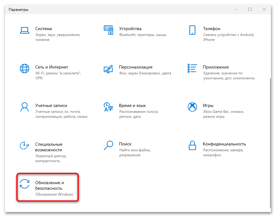- Через «Параметры» перейдите в раздел «Обновление и безопасность».