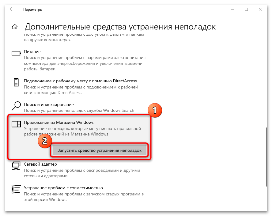 Поскольку «Фотографии» — приложение из Microsoft Store, проверять на наличие ошибок нужно именно фирменный магазин. Найдите соответствующий пункт в списке, кликните по нему левой кнопкой мыши. Появится дополнительная кнопка, запускающая проверку неполадок.