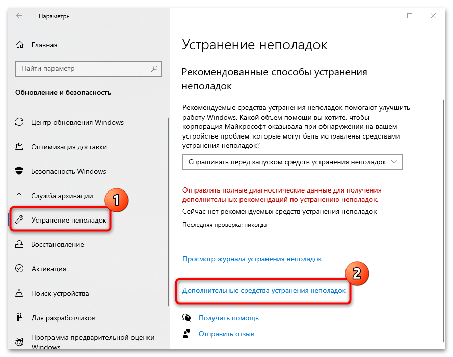Нажмите на вкладку «Устранение неполадок» и кликните по строке «Дополнительные средства устранения неполадок».