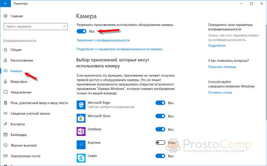 Сделать это можно в «Пуск» – «Параметры». Раздел «Конфиденциальность», вкладка «Камера».