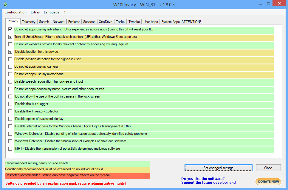 The options are neatly categorized into various tabs and color-coded by their impact on your system. Green options can be freely disabled, while the yellow and red settings must be considered individually based on which Microsoft services you want to keep working.