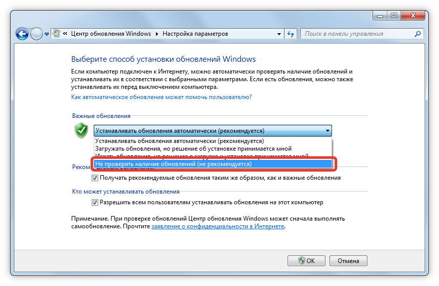- В выпадающем меню выбрать «Не проверять наличие обновлений».