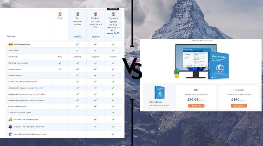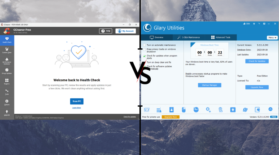 This part of the comparison of CCleaner vs Glary Utilities showed that CCleaner is longer on the market, has more users, and has better proposals for business than Glary. So, CCleaner so far is the winner here. However, the number of functions for both optimizers is impressive, so at this stage, it is not clear who wins, let’s check below.