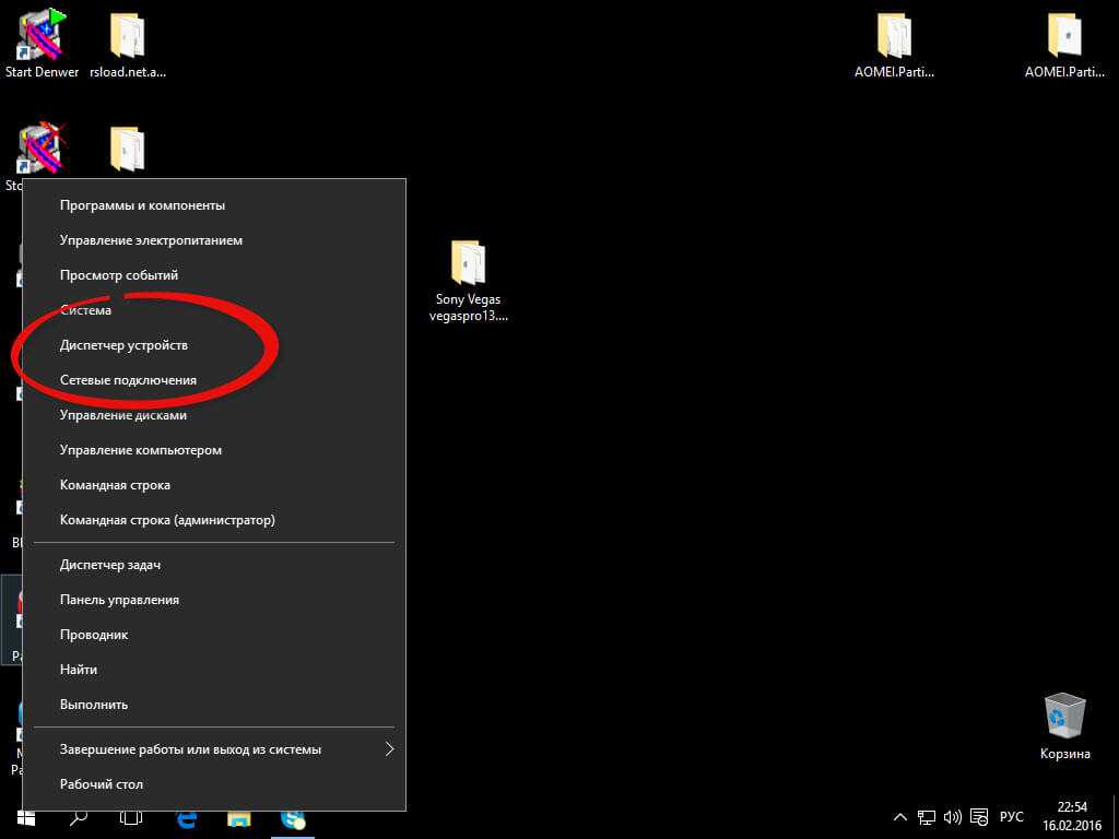 - Зайдите в диспетчер устройств (можно через меню, которое открывается по правому клику на кнопке Пуск).