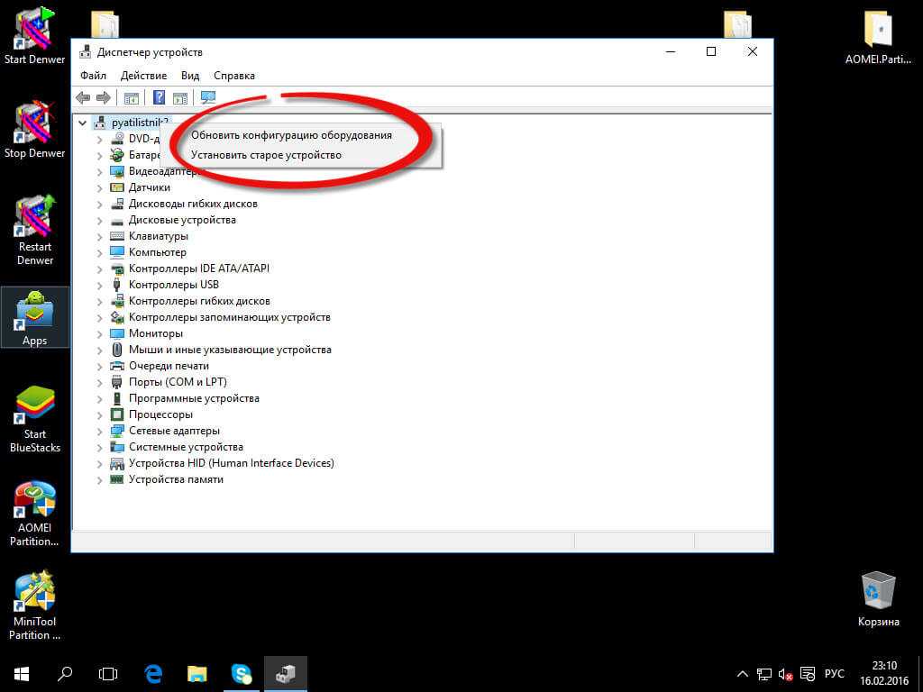 - Зайдите в диспетчер устройств и в меню выберите Действие — Обновить конфигурацию оборудования.