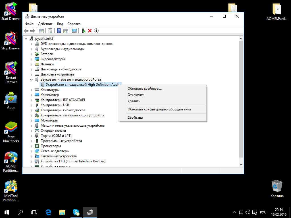 - Предварительно удалить звуковую плату (из раздела Звуковые, игровые и видео устройства) и все устройства из раздела аудиовходы и аудиовыходы через диспетчер устройств (правый клик по устройству — удалить),