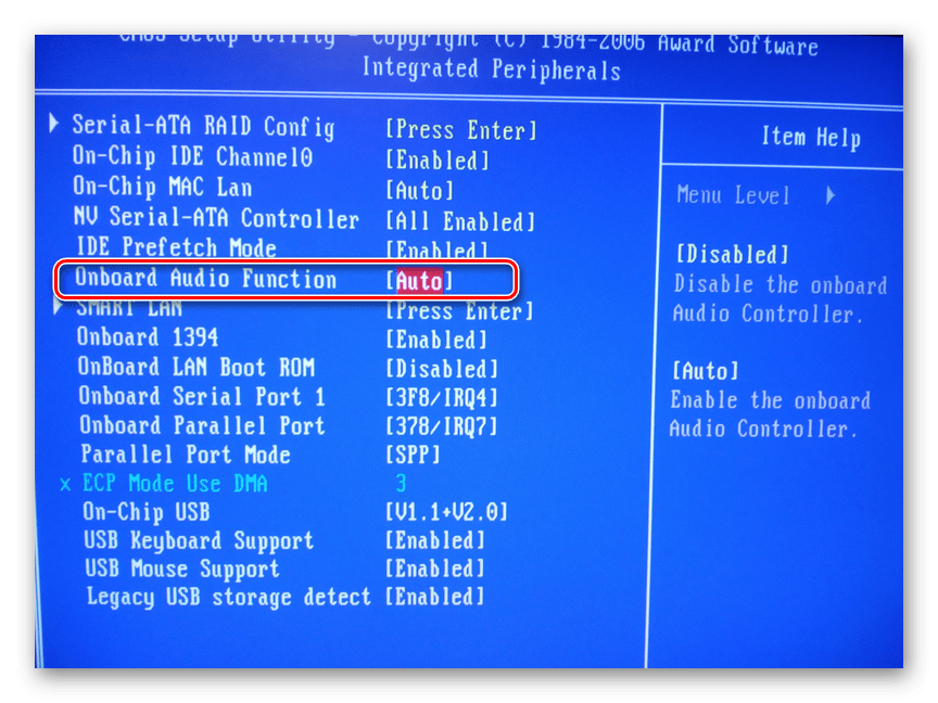В данном случае необходимо удостовериться, что встроенное аудиоустройство разрешено в БИОС. Искать данный параметр нужно в разделе «Interated Peripherals». О правильной настройке свидетельствует установленное значение «Auto».