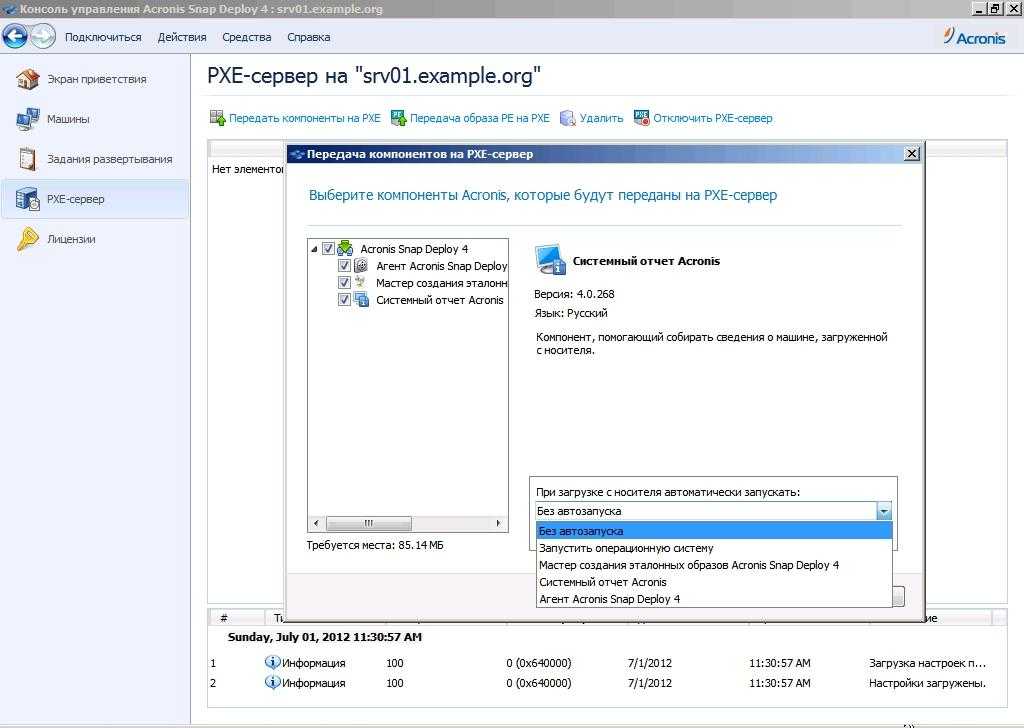 Для решения поставленных задач ASD использует несколько компонентов: сервер развертывания (Deploy Server), консоль управления, PXE-сервер, агент управления и сервер лицензий, которые могут быть установлены на ПК под управлением Windows XP и выше. Еще один компонент — Wake-on-LAN Proxy — позволяет включать компьютеры, находящиеся в другой подсети, куда не проходит сигнал Wake-on-LAN. Компоненты можно устанавливать на одну или разные машины. Учитывая, что Deploy Server обычно хранит все образы, может понадобиться хард большой емкости. Для консоли управления подойдет обычный ПК, работающий под управлением десктопной версии Windows. Также с помощью консоли можно установить на удаленные системы остальные компоненты ASD, для чего необходимо перейти в «Сервис -> Установить компоненты удаленно», затем выбрать нужное в %ProgramFiles%Common FilesAcronisSnapDeployRemoteInstall и указать IP или имя ПК. При этом потребуются права администратора. Если удаленный ПК работает под управлением Win7, обязательно отключи UAC.