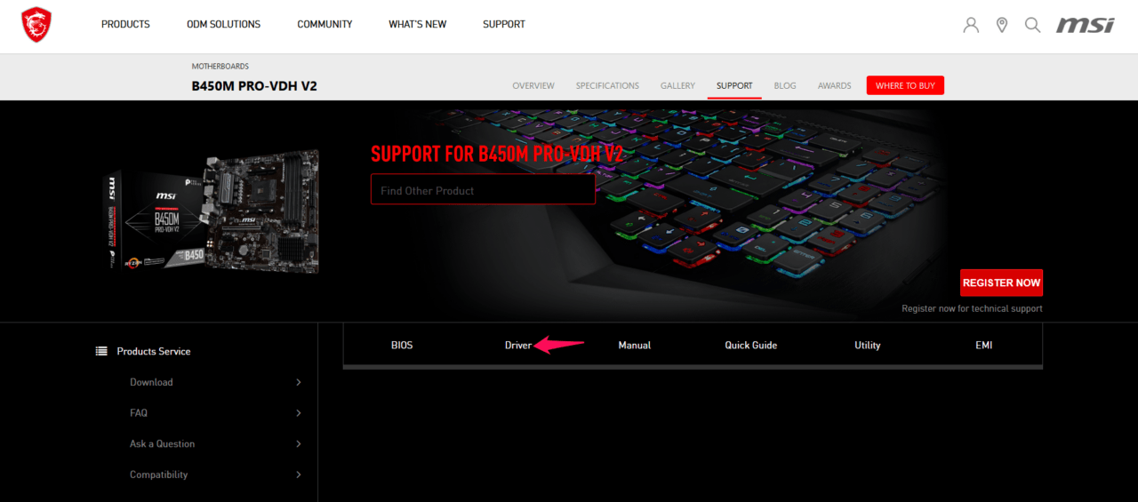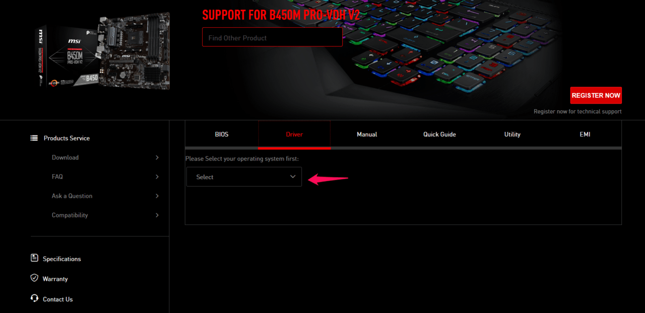 - Type the motherboard/laptop model number/pre-build desktop model number and open the official site page.