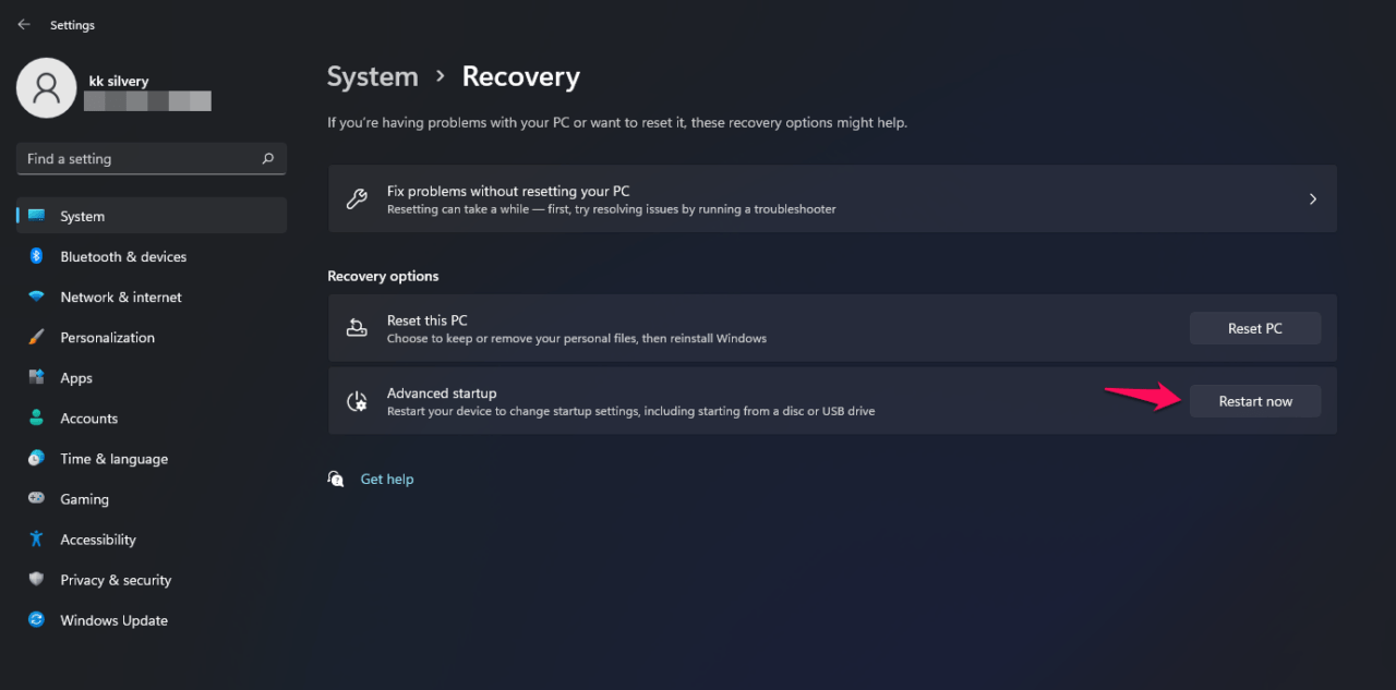 Click on the “Restart now” button.