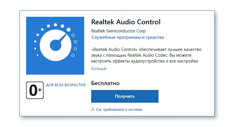 Если выполнять поиск по приложениям в Microsoft Store, приложение, которое в магазине имеет название Realtek Audio Control, вы не найдёте. Однако можно воспользоваться прямой ссылкой: