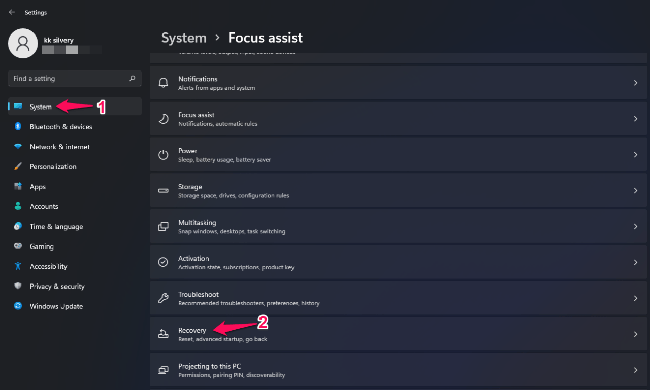 - Choose “Recovery” under the “System” option.