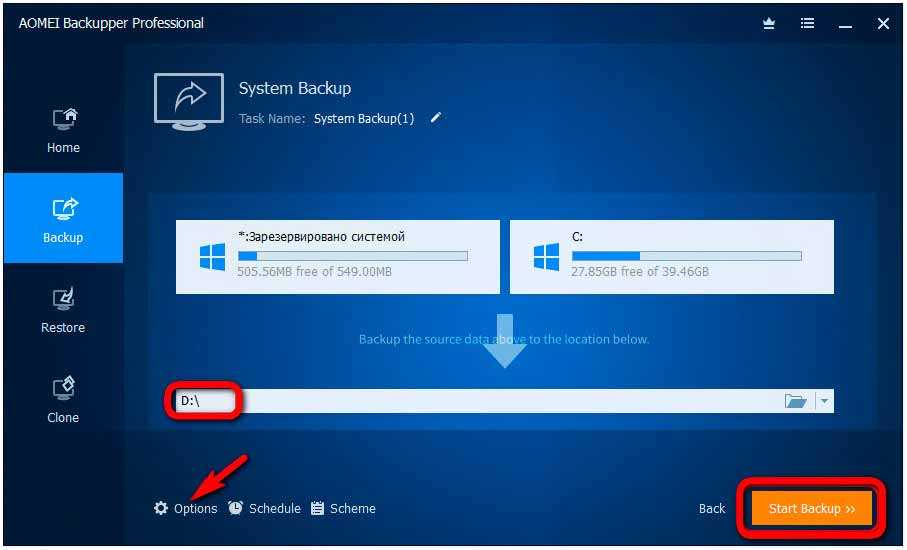 Указываем раздел для хранения резервной копии и жмём «Start Backup». Если копию на другой компьютер нужно перенести с использованием флешки, недостаточной вместимости или с использованием облачных хранилищ в рамках их бесплатного тарифа, прежде запуска создания бэкапа можем нажать опцию «Options».