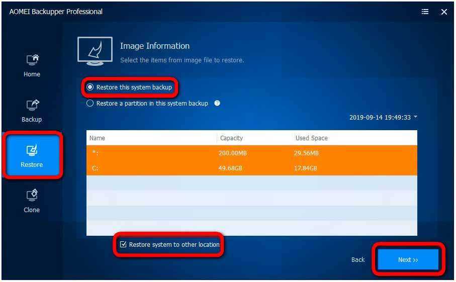 После того, как Sysprep очистит Windows, загружаемся с носителя AOMEI Backupper. Делаем резервную копию системы, как показано в предыдущем пункте статьи. Далее переносим файл копии на другой компьютер. И восстанавливаем на нём Windows из копии.