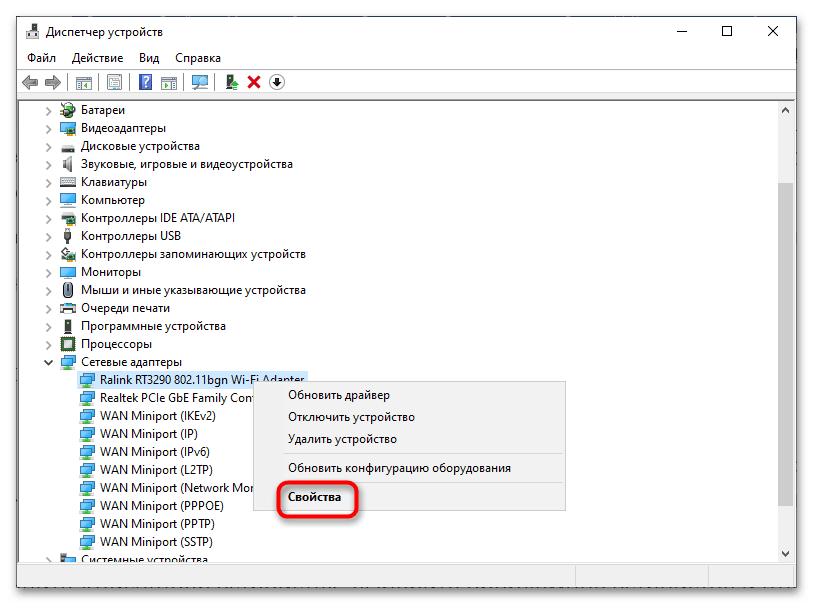 - Запустите «Диспетчер устройств», выберите проблемное устройство и откройте его свойства.