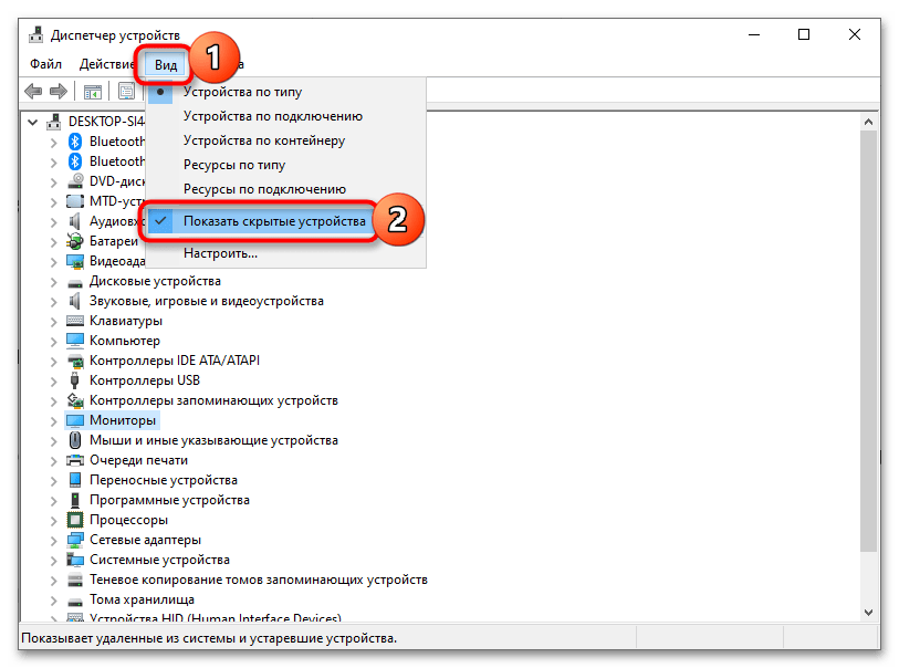 - Откройте «Диспетчер устройств» и активируйте в меню «Вид» опцию «Показать скрытые устройства».