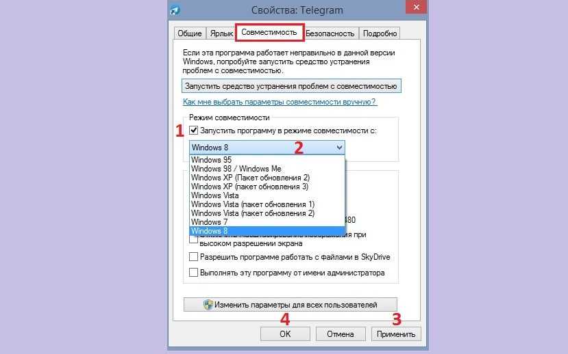 - В разделе Режим совместимости установите галочку, чтобы активировать возможность выбора альтернативной версии Windows.