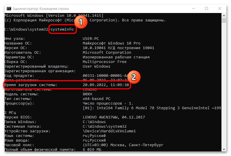 В окне «Командной строки», запущенной от имени администратора, введите  и нажмите на клавишу «Enter». Отыщите строку «Время загрузки системы»: здесь отобразится дата и время включения Windows 10.