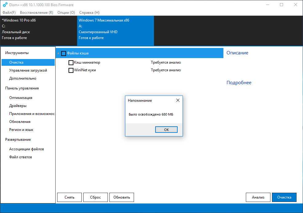 Наконец, заключительный этап — сохранение настроенной сборки в установочный ISO-образ с помощью той же Dism++. Перед сохранением в образ желательно очистить сборку от временных файлов, это позволит уменьшит размер дистрибутива. Смонтируйте в оснастке управления дисками VHD-файл, запустите Dism++, выберите на панели инструментов «Очистка».