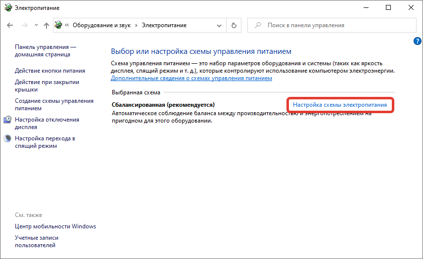 Откройте раздел «Электропитание» по инструкции выше. Щелкните «Настройка схемы электропитания».
