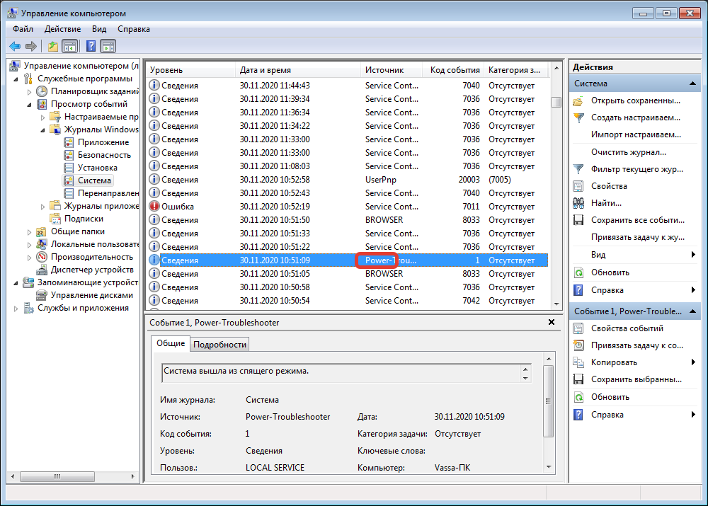 В левой области окна разверните папку «Журналы Windows». Просмотрите журналы и входящие в них события. Около событий ищите источник «Power-Troublehooter». Найдя подобное событие, щелкните по нему левой кнопкой мыши и ниже просмотрите, какое именно приложение вызвало запуск компьютера (поскольку в нашем случае система работает нормально, приложение в пункте 3 не отображается).
