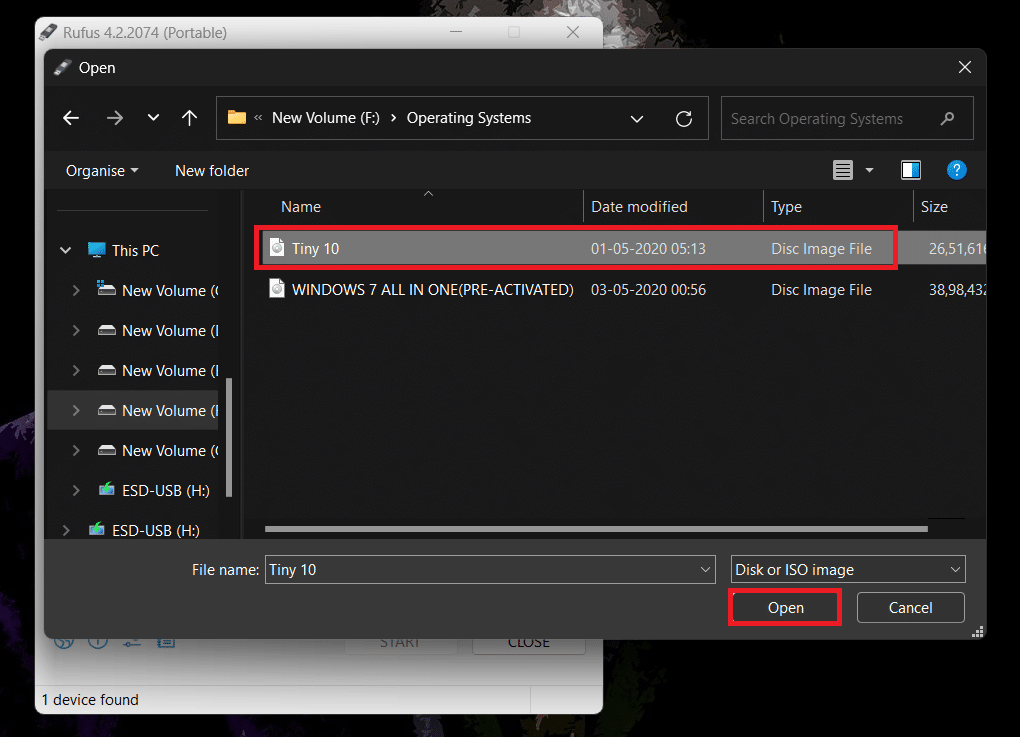 Head to the location where the Tiny10 ISO is downloaded. Select the ISO file, and then click on the Open button.